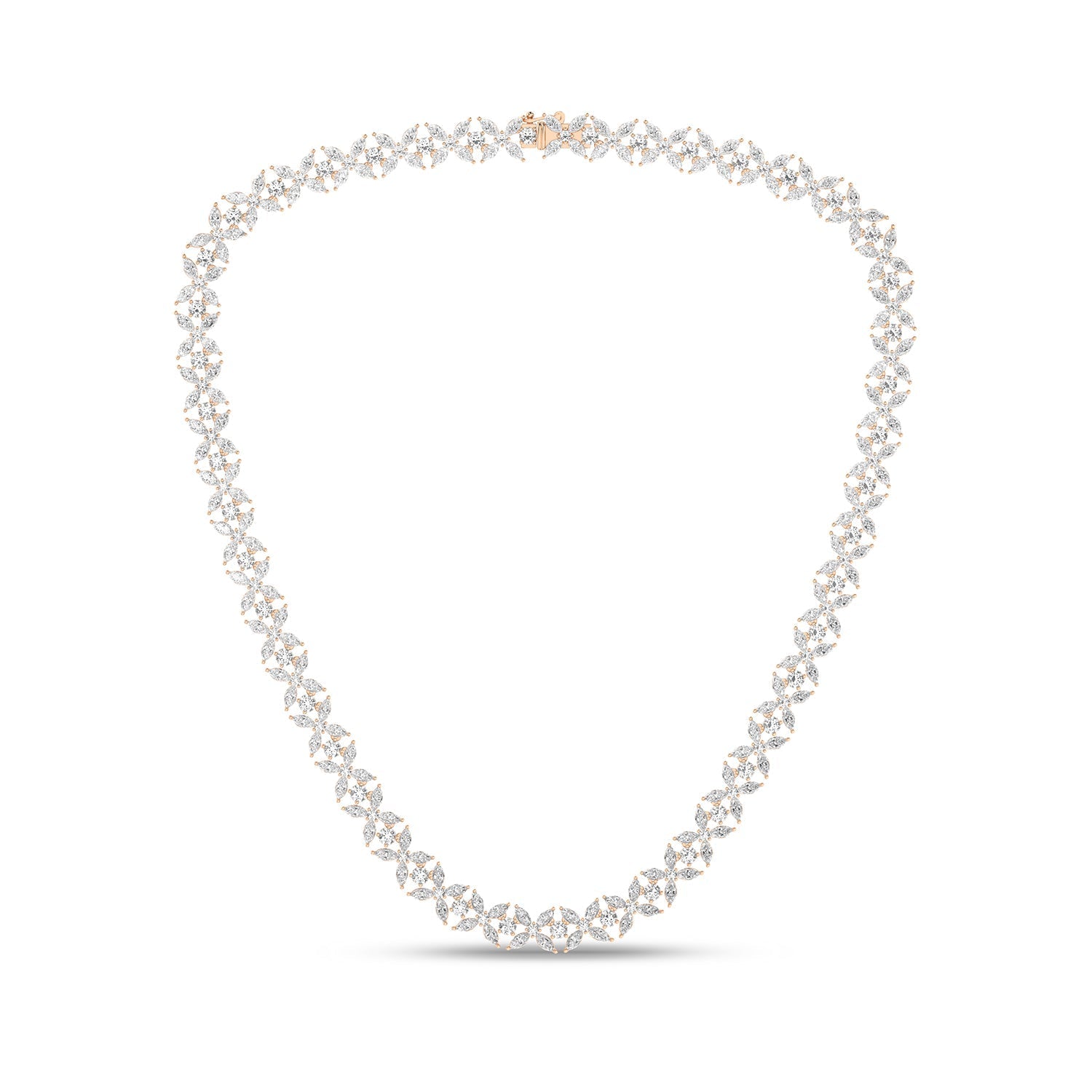 Unveil a symphony of elegance with the Alyssa Marquise Bouquet Tennis Necklace. This breathtaking masterpiece showcases a continuous row of enchanting diamond florets set in lustrous gold. Each floret—crafted from four marquise-cut diamonds encircling a brilliant round diamond at its heart—is delicately separated by additional round-cut diamonds, creating an endless play of sparkle and sophistication. Designed to make every moment unforgettable, this statement necklace perfectly complements bridal wear, weddings, and any occasion that calls for timeless grace and brilliance.
