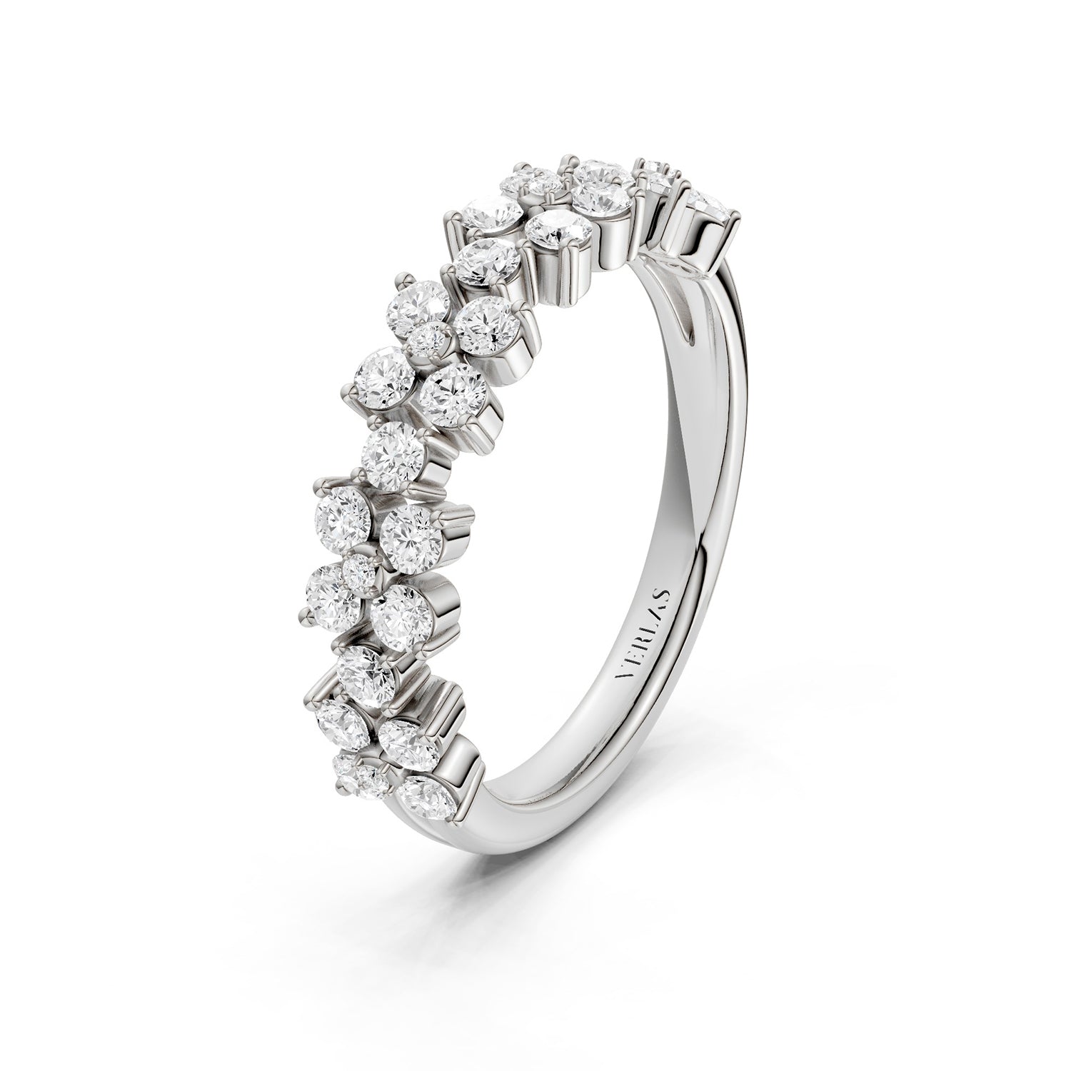 Clarity, one of the “Four C’s,” measures a diamond’s naturally-occuring imperfections (also called ‘inclusions’ or ‘flaws.’). Per gemological standards, diamond clarities are categorized as Flawless (F), Internally Flawless (IF), Very Very Slightly included (VVS), Very Slightly included (VS) and Included (I). Under 10x magnification, Flawless diamonds do not show any inclusions. Higher-clarity diamonds are rarer and pricier. However, many types of inclusions are invisible even to the naked eye, not to mention they give natural diamonds their unique character. Verlas strikes a balance between clarity and price point which is why we offer hand-cut VS and SI clarity diamonds certified by IGI. You can always contact Verlas Concierge for a different diamond clarity on your favorite Verlas designs.