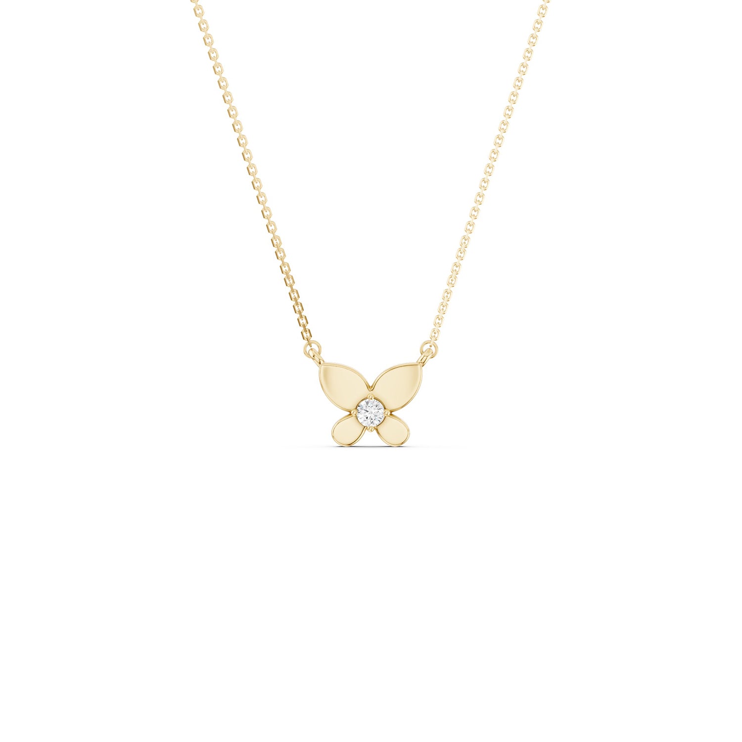 The Butterfly Solitaire Diamond Necklace presents a stylized butterfly motif with a clean, modern silhouette. Four contoured wings create gentle dimension, with elongated upper wings balanced by softly rounded lower wings. A single round brilliant diamond sits at the center in a four-prong setting. Fine jump rings connect the cable chain to the upper wings, ensuring the pendant remains level and well-balanced when worn.