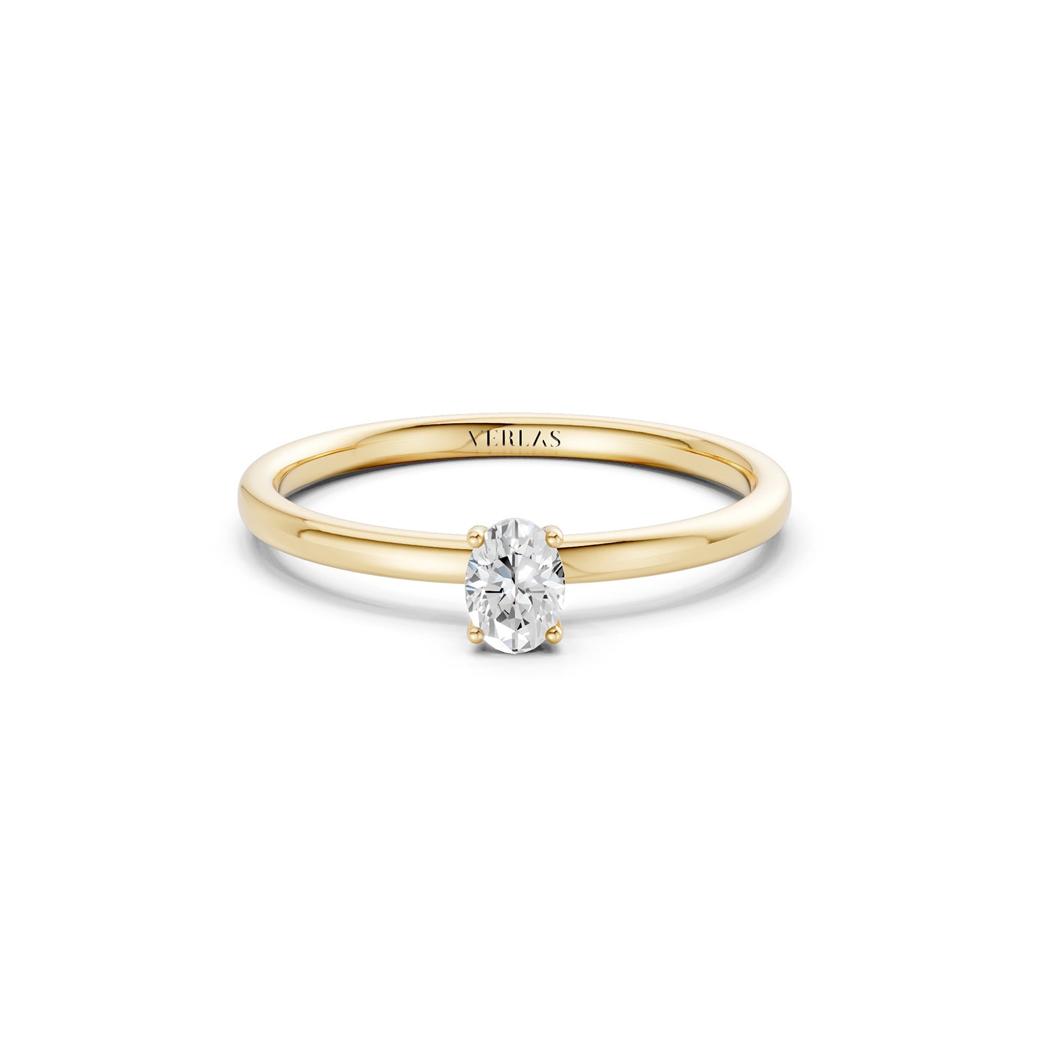 The Ellipse Iconic Peg Head Diamond Ring features an elongated oval-cut diamond secured by four slender claw prongs. The elevated peg head with an open under-gallery raises the center above the band. A round comfort-fit shank with consistent width supports a clean, refined design, focusing attention on the oval form and its balanced proportions.