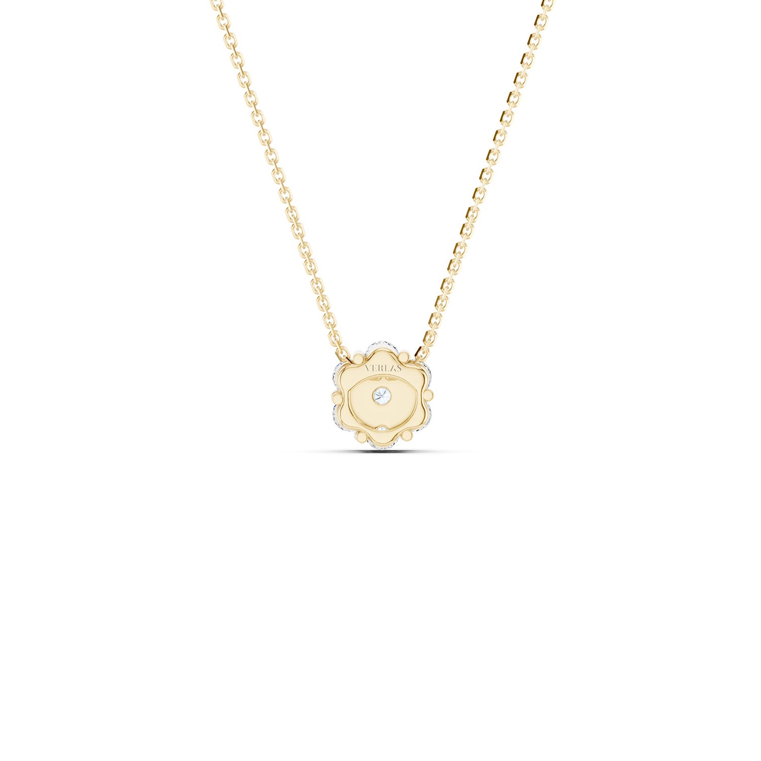 The Floating Bloom Diamond Pendant features a floral cluster of seven round brilliant lab-grown diamonds, with a central diamond framed by six surrounding diamonds. Rounded bead-style prongs define the form, while a raised basket gallery adds dimension. An integrated slide bail allows the pendant to rest flat against the skin, complemented by a fine cable chain for refined, balanced wear.