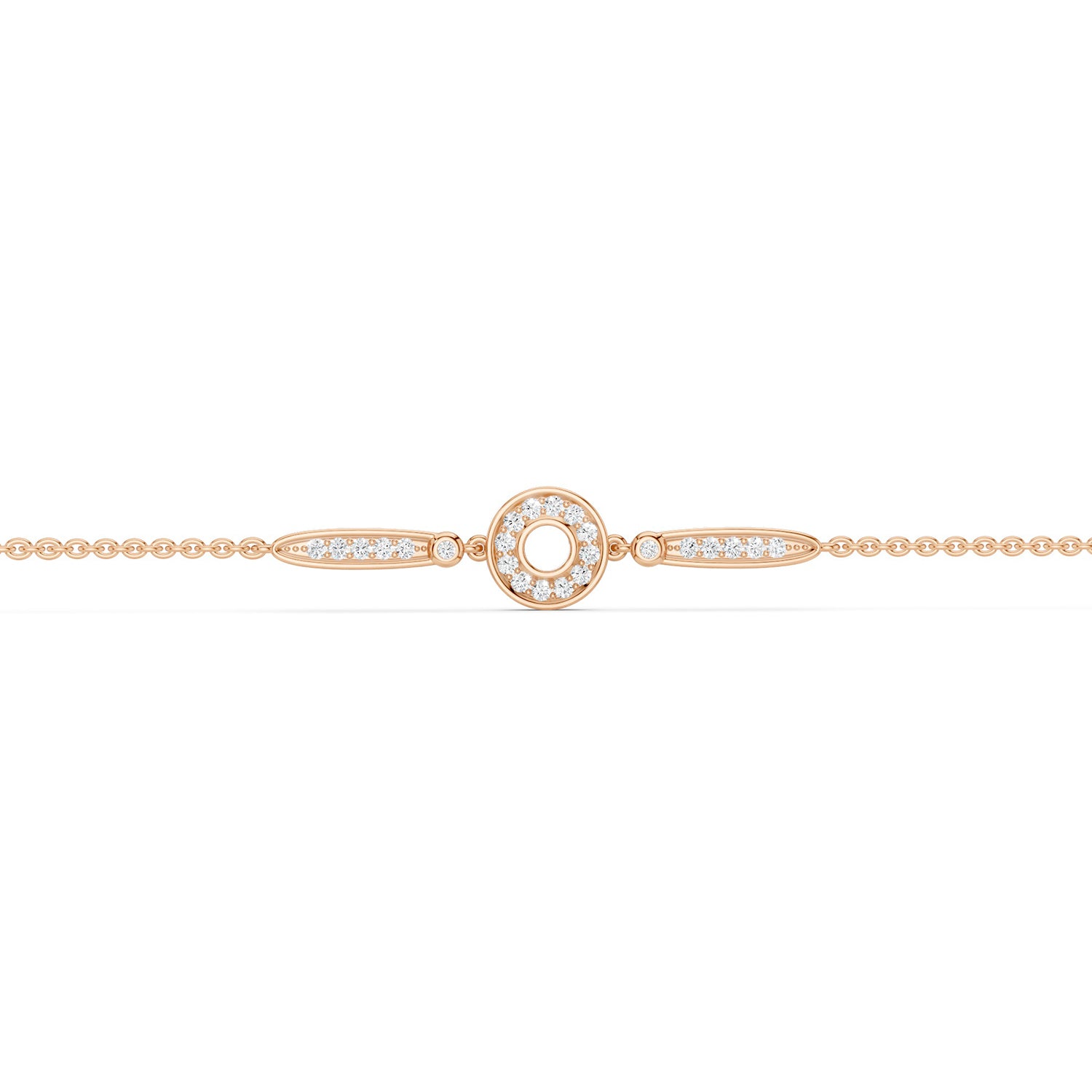 Designed with a refined balance of form and flow, this bracelet features a striking open-circle halo at the center, delicately framed with round brilliant diamonds for a soft, radiant glow. Elongated marquise-shaped gold links on either side are accented with precisely set diamonds, adding structure while maintaining an elegant, fluid silhouette. Set on a fine gold chain and finished with a secure clasp, the design sits effortlessly on the wrist, offering lightness, comfort, and everyday sophistication.