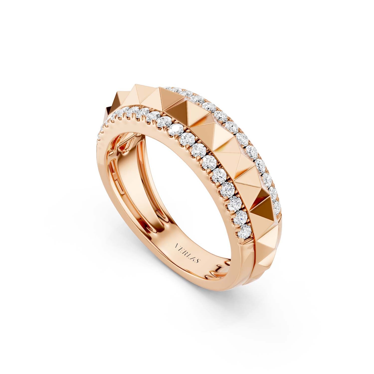 Bold and architectural, the Zenyth Pyramid Spiked Diamond Band from New York–based Verlas redefines modern luxury. Featuring a sculptural row of pyramid-style studs encircling the band, it is accented by twin rows of pavé-set lab-grown diamonds for striking brilliance. Designed for those who express individuality with confidence, this statement ring transitions effortlessly from everyday wear to meaningful milestones.