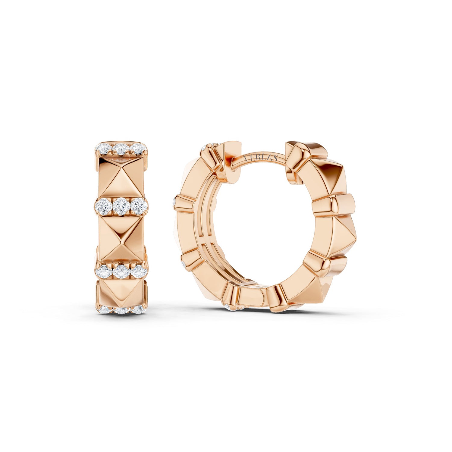 Sculptural and refined, the Zenyth Tiered Pyramid Diamond Huggies from New York–based Verlas feature a staggered silhouette with polished pyramid motifs accented by trios of brilliant lab-grown diamonds. The striking geometry and radiant sparkle create depth and dimension, making these huggies an elegant choice for effortless day-to-night styling.