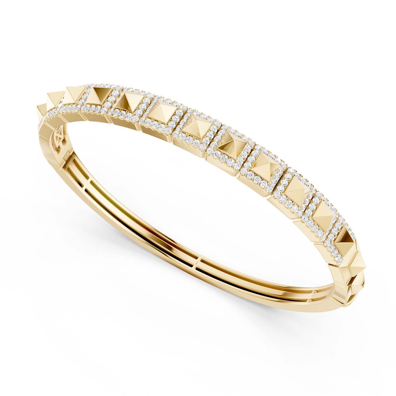 Shop the Zenyth Pyramid Luxe Geometric Bangle. This stunning diamond bangle showcases a row of three-dimensional pyramids in square-shaped settings along the top half, each adorned with lab-grown diamonds for a sharp and contemporary look. Loved by Men & Women alike this design exudes elegance and modernity, with a geometric flair created by the square settings that offer a striking contrast to the smooth circular shape of the bangle. Elevate your style with this sophisticated and eye-catching piece.