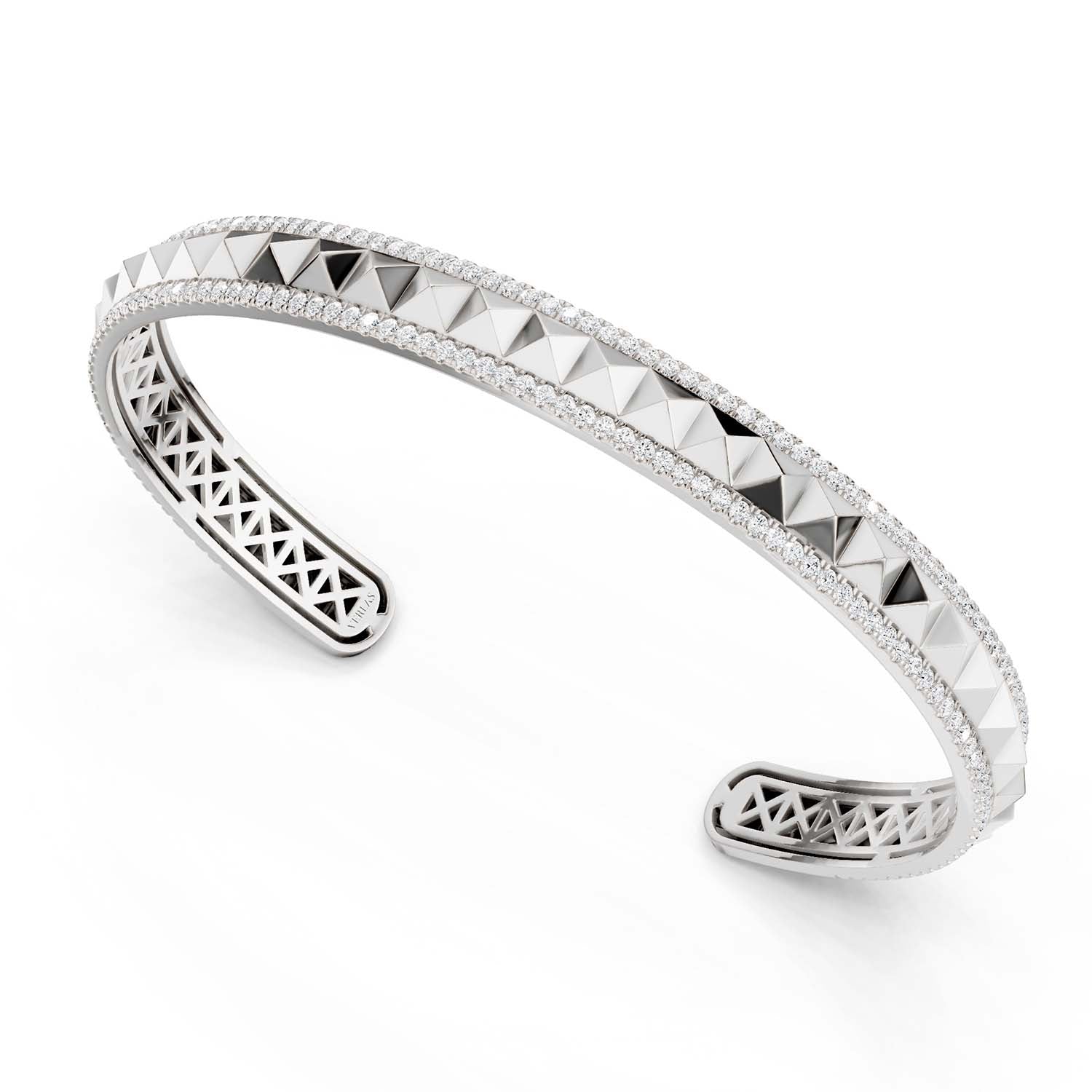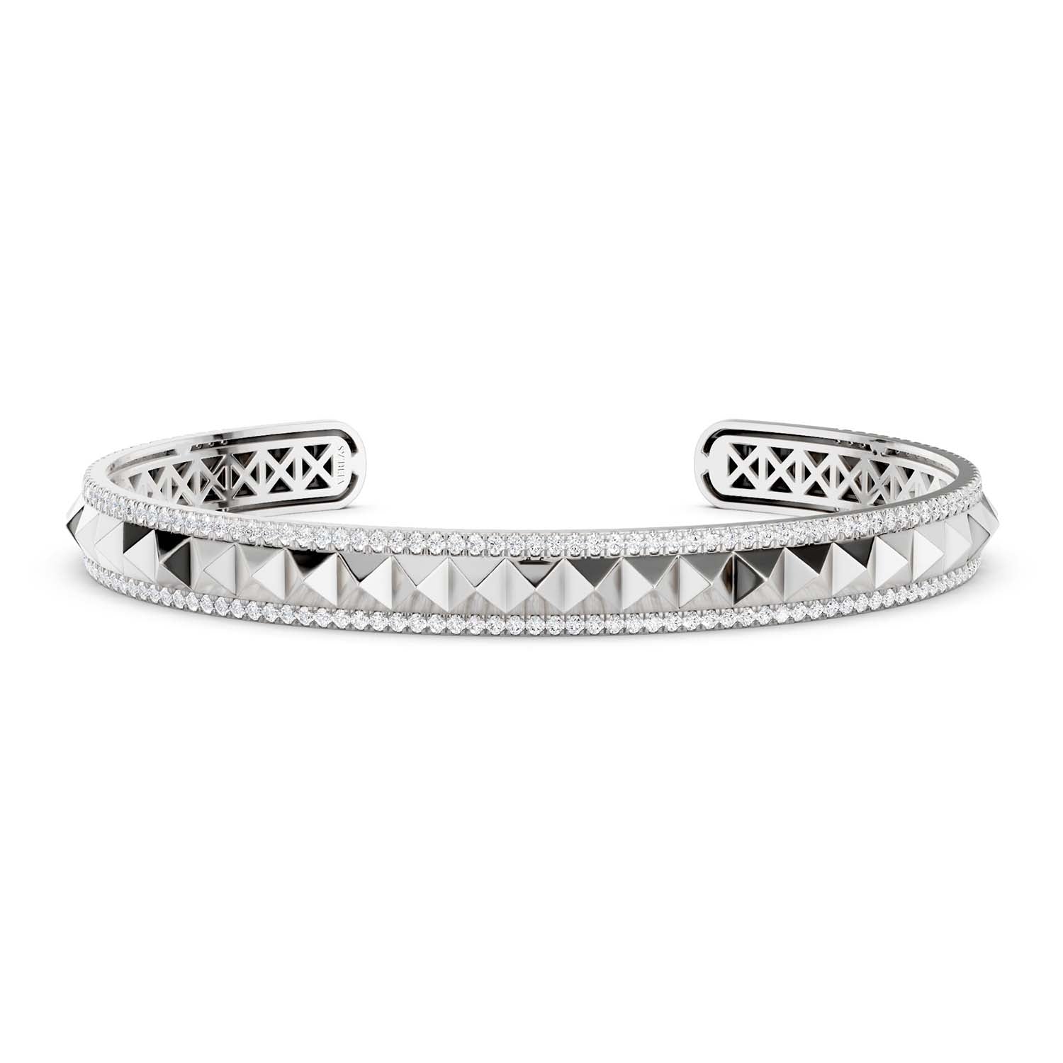 Step into the spotlight with the Pyramid Spiked Diamond Cuff Bracelet, where avant-garde design meets timeless elegance. This striking piece features a continuous row of bold pyramid motifs that wrap around the cuff, symbolizing your unique style and confidence. Adorning the pyramids are two radiant rows of dazzling lab-grown diamonds that sparkle with every movement, ensuring you shine bright on any occasion. Perfect for the modern individual who values both artistry and sustainability, this diamond bracelet effortlessly enhances any outfit, making it an essential accessory for both casual outings and special events. Embrace your individuality and let this stunning cuff be your signature statement piece.